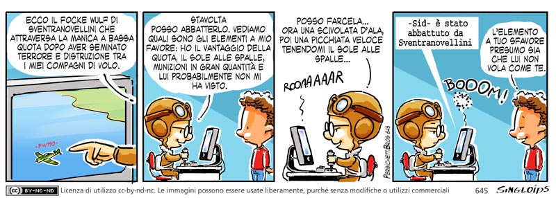 Sid: Ecco il Focke-Wulf di Sventranovellini che attraversa la Manica a bassa quota dopo aver portato terrore e distruzione tra i miei compagni di volo. – Sid: Stavolta posso riuscire ad abbatterlo. Vediamo quali sono gli elementi a mio favore: ho il vantaggio della quota, il sole alle spalle, munizioni in gran quantità e probabilmente non mi ha visto. Posso farcela, ora una scivolata d’ala, poi una picchiata veloce tenendo il sole alle mie spalle. – Computer: Booom! -Sid- è stato abbattuto da Sventranovellini. – Bob: Quello a tuo sfavore presumo sia che lui non vola come te.