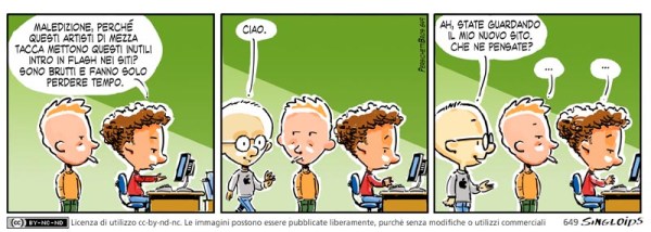 Bob: Maledizione, perché questi artisti di mezza tacca mettono questi inutili intro in flash nei siti? Sono brutti e fanno solo perdere tempo. – Sid: Ciao. – Sid: Ah, state guardando il mio nuovo sito. Che ne pensate?