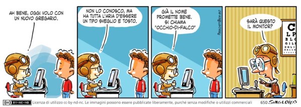 Sid: Ah bene, oggi volo con un nuovo gregario. Non lo conosco, ma ha tutta l’aria d’essere un tipo sveglio e tosto. Già il nome promette bene. Si chiama “occhio-di-falco”. – Occhio di falco: Sara questo il monitor?
