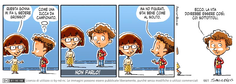 Meg: Questa gonna mi fa il sedere grosso? – Bob (pensa): Come un zucca da campionato. – Bob: Ma no figurati, stai bene come al solito. – Bob: Ecco, la vita dovrebbe essere così: coi sottotitoli.