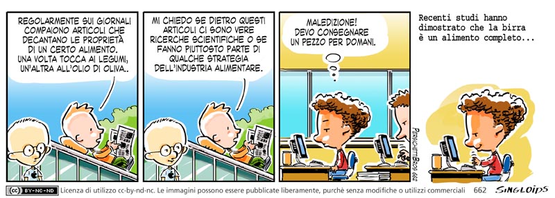 Ted: Regolarmente sui giornali compaiono articoli che decantano le proprietà di un certo alimento. Una volta tocca ai legumi, un’altra all’olio di oliva… – Ted: Mi chiedo se dietro questi articoli ci sono vere ricerche scientifiche o se fanno piuttosto parte di qualche strategia dell’industria alimentare. – Bob (pensa): Maledizione! Devo consegnare un pezzo per domani. – Bob: Recenti studi hanno dimostrato che la birra è un alimento completo…