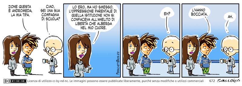 Emo: Zione questa è Andromeda, la mia tipa. – Sid: Ciao, sei una sua compagna di scuola? – Andromeda: Lo ero, ma ho smesso. L’oppressione parentale di quella istituzione non si confaceva all’anelito di libertà che alberga nel mio cuore. – Sid: eh? – Emo: L’hanno bocciata. – Sid: ah.
