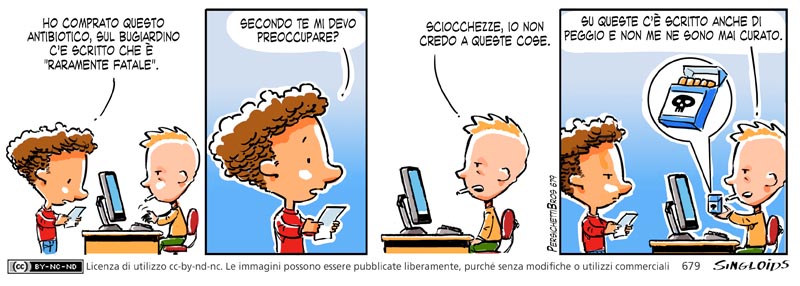 Bob: Ho comprato questo antibiotico, sul bugiardino c’è scritto che è “raramente fatale”. Secondo te mi devo preoccupare? – Ted: Sciocchezze, io non credo a queste cose. Su queste c’è scritto anche di peggio e non me ne sono mai curato.