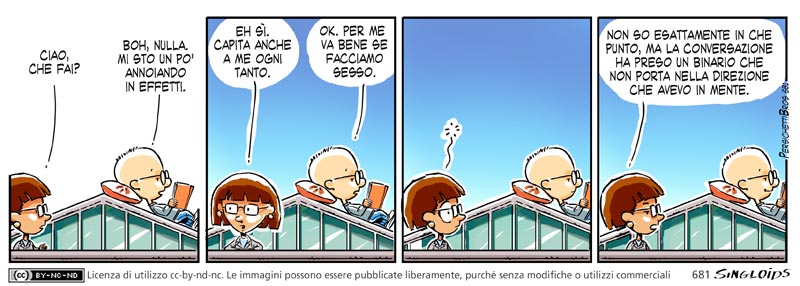 Meg: Ciao, che fai? – Sid: Boh, nulla. Mi sto un po’ annoiando in effetti. – Meg: Eh sì. capita anche a me ogni tanto. – Sid: Ok. Per me va bene se facciamo sesso. – Meg: Non so esattamente in che punto, ma la conversazione ha preso un binario che non porta nella direzione che avevo in mente.