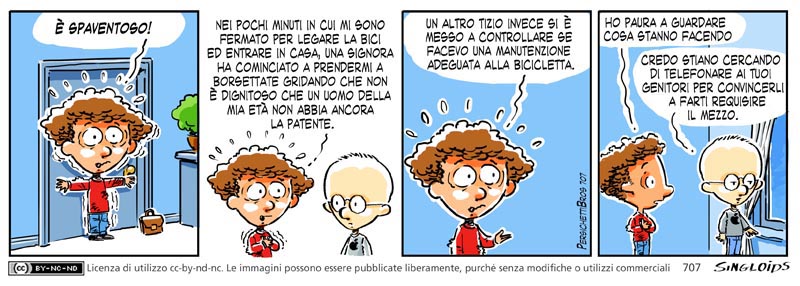 Bob: E’ spaventoso là fuori! Nei pochi minuti in cui mi sono fermato per legare la bici ed entrare in casa, una signora ha cominciato a colpirmi con la borsetta gridando che non è dignitoso che un uomo della mià età non abbia ancora la patente. Un altro passante si è messo a controllare se facevo una manutenzione adeguata alla mia bici.. Ho paura a guardare cosa stanno facendo. Sid: Credo stiano cercando di telefonare ai tuoi genitori per convincerli a farti requisire la bicicletta.