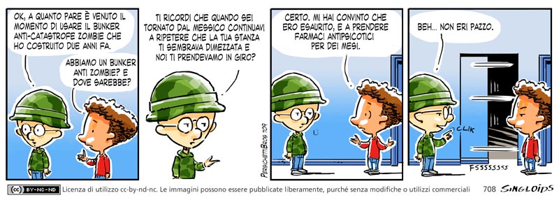 Sid: Ok, a quanto pare è venuto il momento di usare il bunker anti catastrofe zombie che ho costruito due anni fa. – Bob: Abbiamo un bunker anti zombie? E dove sarebbe? – Sid: Ricordi che quando tornasti dalle vacanze in Messico continuavi a ripetere che la tua stanza ti sembrava dimezzata e noi ti prendevamo in giro? – Bob: Certo. Tu mi convincesti che soffrivo di un esaurimento e a seguire per mesi una terapia a base di antipsicotici. – Sid: Beh… non eri pazzo.