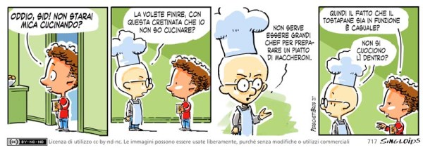 Bob: Omiodio sid! Non starai cucinando? – Sid: La volete piantare con questa diceria che non so cucinare? Non serve essere grandi chef per preparare un piatto di maccheroni. – Bob: Quindi il fatto che il tostapane sia in funzione è casuale? – Sid: Non si cuociono lì dentro?