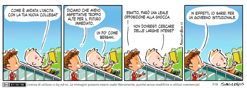 Ted: Come andata l’uscita con la tua nuova collega? – Bob: Diciamo che avevo aspettative troppo alte per il futuro immediato. – Ted: Un po’ come Bersani. – Bob: Esatto, sarò una opposizione leale della gnocca. – Ted: Non dovresti cercare delle larghe intese? – Bob: Io sarei per il governo istituzionale in effetti.