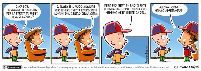 Ted: Ciao Bob. Mi avanza un biglietto per la partita di rugby. Ti va di andarci? – Bob: Il rugby è il modo migliore per tenere trenta energumeni lontani dal centro della città. – Ted: Però puoi berti un paio di pinte di birra sugli spalti senza che nessuno abbia niente da dire. – Bob: Allora? Cosa stiamo aspettando?