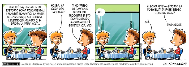 Ragazza: Perché sai per me in un rapporto sono fondamentali le sensazioni, i momenti romantici, la magia dell’incontro, gli sguardi, l’elettricità quando ci si sfiora la prima volt… Scusa ma cosa stai facendo? – Bob: Ho preso un campione del tuo DNA dal tuo bicchiere e sto confrontando la compatibilità genetica col mio. – Ragazza: ah… – Bob: Mi sono appena giocato la probabilità di fare sesso stasera, vero? – Ragazza: già. – Bob: dannazione