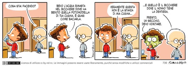 Sid: Cosa stai facendo? – Bob: Bevo l’acqua rimasta nel bicchiere dove ha bevuto quella fotomodella di tua cugina. è quasi come baciarla. – Sid: Veramente questa non è la stanza di mia cugina… – Sid: …e quello è il bicchiere dove il nonno tiene la sua dentiera. – Bob: presto un secchio, devo vomitare.