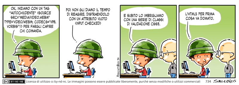 Bob: Ok iniziamo con un Tag ‘autochiudente’ per fargli capire chi comanda. – Bob: Poi non gli diamo il tempo di reagire, distraendolo con un attributo vuoto – Bob: E subito lo imbrigliamo con una serie di classi di validazione css3. – Bob: L’html5 per prima cosa va domato.