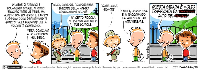 Ted: Quattro settimane di farmaci e isolamento totale. Ho bruciato tutti i miei giorni di ferie, ma almeno non ho perso il lavoro e adesso sono definitivamente guarito. – Bob: Vero. Comiciavo a preoccuparmi sul serio. – Bambina scout: Scusi signore, comprerebbe i biscotti della nostra associazione scout? – Ted: Ma certo piccola, ne prendo volentieri due scatole. – Scout contenta: Grazie mille signore. – Ted: Di nulla principessa. e mi raccomando fate attenzione ad attraversare. – Ted: Questa strada è molto trafficata da #%$£&£#&$ auto del $%&#$£!