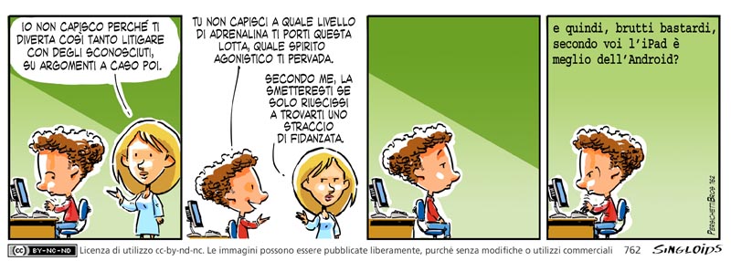 Gea: Io non capisco perché ti diverta così tanto litigare con degli sconosciuti, su argomenti a caso poi. – Bob: Tu non capisci a quale livello di adrenalina ti porti questa lotta, quale spirito agonistico ti pervada. – Gea: Secondo me la smetteresti se solo tu riuscissi a trovarti uno straccio di fidanzata. – Bob: E quindi, brutti bastardi, secondo voi un iPad è meglio di un android?