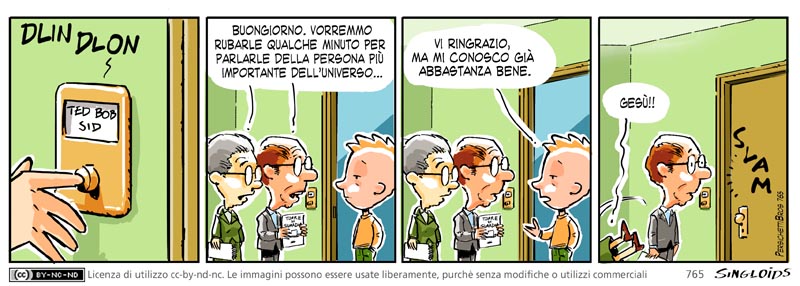 Testimone di Geova: Buongiorno. Vorremmo rubarle qualche minuto per parlarle della persona più importante dell’universo… – Ted: Vi ringrazio, ma mi conosco già abbastanza bene. – Testimone di Geova: GESU’!!>