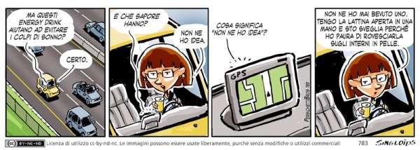 GPS: Ma questi energy drink aiutano ad evitare i colpi di sonno? – Meg: Certo. – GPS: E che sapore hanno? – Meg: Non ne ho idea. – GPS: Cosa significa non ne ho idea? – Meg: Non ne ho mai bevuto uno. Tengo la lattina aperta in una mano e sto sveglia perché ho paura di rovesciarla sugli interni in pelle.