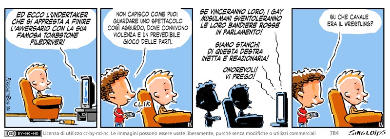 Telecronista: Ed ecco l’Undertaker che si appresta a finire il suo avversario con la sua famosa Tombstone Piledriver! – Bob: Non capisco come puoi guardare uno spettacolo così assurdo, dove convivono violenza e un prevedibile gioco delle parti. – TV: Se vinceranno loro i gay musulmani sventoleranno le loro bandiere rosse in Parlamento! – TV: Siamo stanchi di questa destra inetta e reazionaria! – TV: Onorevoli! Vi prego! – Bob: Su che canale era il Wrestling?