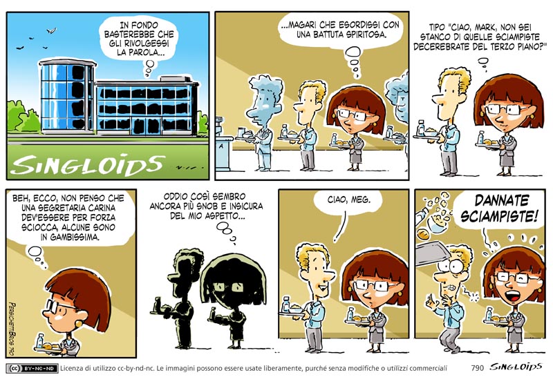 Meg (pensa): In fondo basterebbe che gli rivolgessi la parola… magari che esordissi con una battuta spiritosa. – Meg (pensa): Tipo “ciao Mark, non sei stanco di essere circondato da quella stupide segretarie shampiste del terzo piano? – Meg (pensa): “beh ecco non volevo dire che le segretarie avvenenti sono per forza stupide. Ne conosco alcune molto in gamba. Oddio così sembro ancora più snob e insicura del mio aspetto…” – Mark: Ciao Meg. – Meg: Dannate shampiste!