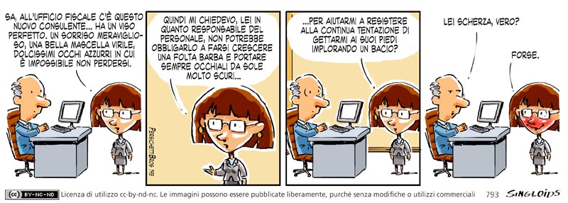 Meg: Sa, c’è questo nuovo consulente dell’ufficio fiscale. ha un viso perfetto. un sorriso meraviglioso, una bella mascella virile, dolcissimi occhi azzurri in cui è impossibile non perdersi. – Meg: Qindi mi chiedevo, lei in quanto responsabile del personale, non potrebbe obbligarlo a farsi crescere una folta barba e portare sempre occhiali da sole molto scuri per aiutarmi a resistere alla continua tentazione di cadere ai sui piedi implorando per un bacio? – Boss: Sta scherzando vero? – Meg: Forse.