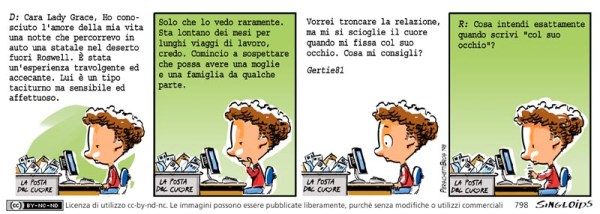 D: Cara Lady Grace, Ho conosciuto l’amore della mia vita una notte mentre percorrevo in auto una statale nel deserto fuori Roswell. È stata un’esperienza travolgente ed accecante. Lui è un tipo taciturno ma sensibile ed affettuoso. Solo che lo vedo raramente. Sta lontano dei mesi in lunghi viaggi di lavoro, credo. Comincio a sospettare che possa avere una moglie e una famiglia da qualche parte. Vorrei troncare la relazione, ma mi si scioglie il cuore quando mi fissa col suo occhio. Cosa mi consigli? Gertie81 – R: Cosa intendi esattamente quando scrivi “col suo occhio”?