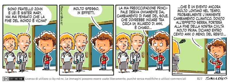 Mormoni: Sono fratello John e lei è sister Mary. Hai mai pensato che la fine del mondo è vicina? – Bob: Molto spesso, in effetti. – Bob: La mia preoccupazione principale deriva ovviamente dal cambiamento di fase del sole, che dovrebbe iniziare tra circa un miliardo di anni. E’ chiaro… – Bob: …che è un evento ancora molto lontano nel tempo. Probabilmente l’imminente cambiamento climatico, dovuto all’effetto serra, porterà alla fine della nostra civiltà
