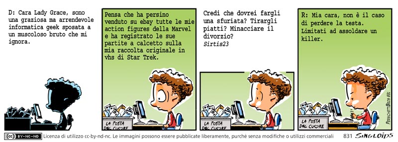 D: Cara Lady Grace, sono una graziosa ma arrendevole informatica geek sposata a un bruto che mi ignora. Lui ha gettato tutte le mie action figures della Marvel, ha registrato le sue partite di calcio sulla mia raccolta originale in vhs di Star Trek. Credi che dovrei fargli una sfuriata? Rompere piatti? Minacciarlo di divorziare? Sirtis23 – R: Mia cara, Non è il caso di perdere la testa. Limitati ad assoldare un killer.
