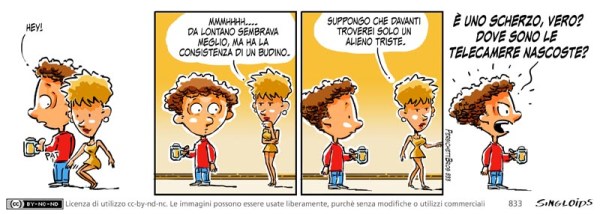 Bob: Hey! – Ragazza: Mmmhhhh…. da lontano sembrava meglio, ma ha la consistenza di un budino. – Ragazza: Suppongo che davanti troverei solo un alieno triste. – Bob: È uno scherzo vero? Dove sono le telecamere nascoste?