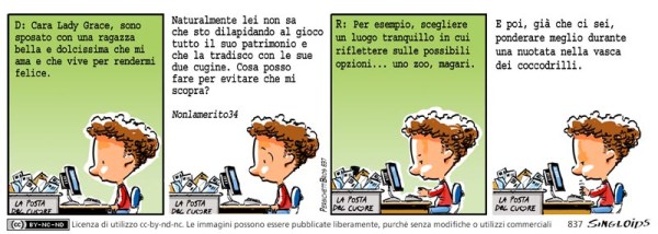 D: Cara Lady Grace, sono sposato con una ragazza bella e dolcissima che mi ama e che vive per rendermi felice. Naturalmente lei non sa che sto dilapidando al gioco tutto il suo patrimonio e che la tradisco con le sue due cugine. Cosa posso fare per evitare che mi scopra? Nonlamerito34 – R: Potresti andare in un luogo tranquillo per ragionare su quali possano essere le tue opzioni. Ad esempio, in uno zoo. Poi visto che sei lì, potresti farti una sana nuotata riflessiva nello stagno dei coccodrilli.