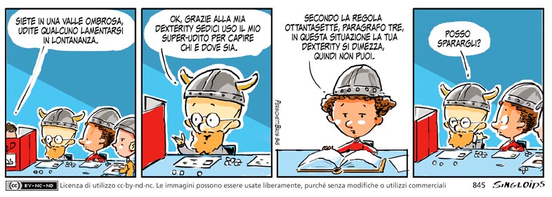 Master: Siete in una valle ombrosa, udite dei lamenti provenire da lontano. – Sid: Ok, grazie alla mia dexterity 16 uso il mio super udito per capire da chi provengono. – Bob: Secondo la regola ottantasette, paragrafo 3, in questa situazione la tua dexterity si dimezza, quindi non puoi. – Sid: Posso sparargli?