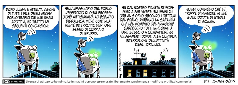 iCoso: Dopo attenta e lunga visione di tutti i file degli archivi pornografici dei miei umani adottivi, ho tratto le seguenti conclusioni: nell’immaginario del porno tutte le professioni, in particolare quelle artigianali come l’idraulica, vengono continuamente interrotte per fare sesso di coppia o di gruppo. Se il nostro pianeta riuscisse a fare in modo che gli umani vivano 24 ore al giorno secondo i dettami del porno, avremmo la garanzia che nel momento dell’invasione gli umani siano tutti impegnati a fare sesso o impegnati a combattere gli allagamenti dovuti alla continua interruzione dell’attività degli idraulici. Quindi consiglio che le truppe d’invasione aliene siano dotate di stivali di gomma