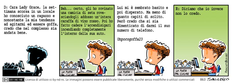 D: Cara Lady Grace, la settimana scorsa ho conosciuto un ragazzo in un locale e nonostante la mia tendenza ad agitarmi ed essere goffa, credo che nel complesso sia andata bene. Beh, certo, gli ho rovinato una camicia di seta rovesciandogli addosso un’intera caraffa di vino rosso, poi ho fatto cadere l’accendisigari incendiandogli completamente l’interno dell’auto. Lui mi è sembrato basito e disperato. Ma meno di quanto mi capita di solito. Però credo che si sia dimenticato di darmi il suo numero di telefono. Unpocogoffa23 – R: Diciamo che io invece non lo credo.