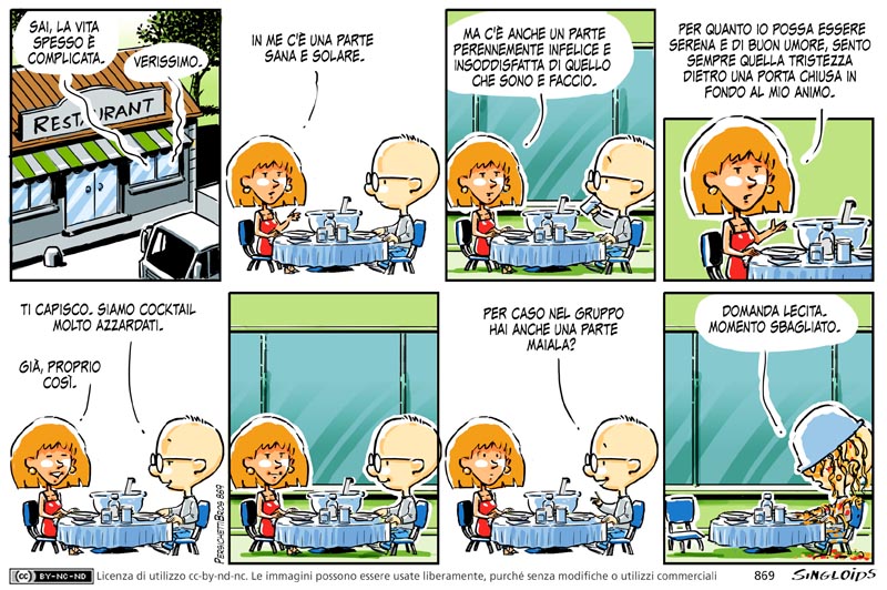 Ragazza: Sai, la vita spesso è complicata. – Sid: Verissimo. – Ragazza: In me c’è una parte sana e solare. Ma c’è anche un parte perennemente infelice e insoddisfatta di quello che sono e faccio. Per quanto io possa essere serena e di buon umore, sento sempre quella tristezza dietro una porta chiusa in fondo al mio animo. – Sid: Ti capisco. Siamo cocktail molto azzardati. – Ragazza: Già, proprio così. – Sid: Per caso nel gruppo hai anche una parte maiala? – Sid: Domanda lecita. momento sbagliato.