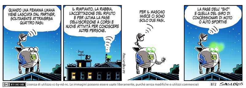 iCoso: Quando un’umana femmina viene lasciata dal partner, solitamente attraversa 4 fasi: Il rimpianto, la rabbia, l’accettazione del rifiuto e per ultima la fase dell’iscrizione a corsi e nuove attività per cambiare la propria vita sociale. Per gli uomini invece ci sono solo due fasi. La fase dell’ “eh?” e quella del giro di concessionari di moto o auto sportive.