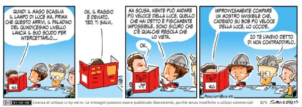 Master: Quindi il mago lancia il lampo di luce ma, prima che questo arrivi, il paladino del quindicesimo livello lancia il suo scudo per intercettarlo… – Master: Ok, il raggio è deviato. Ted ti salvi. – Bob: Ma scusa, niente può andare più veloce della luce, quello che hai detto è fisicamente impossibile. Sono sicuro che c’è qualche regola che lo vieta. – Master: Ok – Master: IMPROVVISAMENTE compare un mostro invisibile che, cadendo su Bob più veloce della luce, lo uccide. – Sid: Io te l’avevo detto di non contraddirlo.
