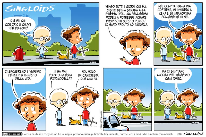 Sid: Che fai qui con crick e chiave per bulloni? – Bob: Vengo ogni giorno a quest’ora sul bordo della strada. Una bellissima modella in auto potrebbe forare una gomma proprio in questo punto e io sarò pronto ad aiutarla. Lei, colpita dalla mia cortesia, mi inviterà a cena e si innamorerà follemente di me. Ci sposeremo e vivremo felici per il resto della vita. – Sid: Ha mai forato una fotomodella? – Bob: Solo un camionista due anni fa. – Bob: Ma ci sentiamo ancora per telefono ogni tanto.