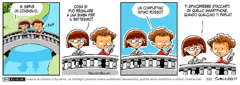 Meg: Mi serve un consiglio. Cosa si può regalare a una bimba per il battesimo? – Bob: Un completino intimo rosso? – Meg: Ti spiacerebbe staccarti da quello smartphone, quando ti qualcuno ti parla?