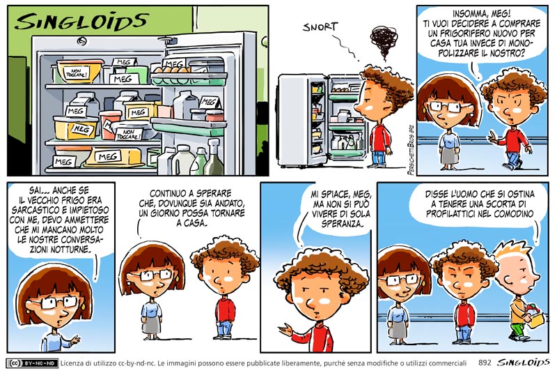 Bob: Insomma, Meg! Ti vuoi decidere a comprare un frigorifero nuovo per casa tua invece di monopolizzare il nostro? – Meg: Sai… anche se il vecchio frigo era sarcastico e impietoso con me, devo ammettere che mi mancano molto le nostre conversazioni notturne. Continuo a sperare che, dovunque sia andato, un giorno possa tornare a casa. – Bob: Mi spiace, Meg, ma non si può vivere di sola speranza. – Ted: Disse l’uomo che si ostina a tenere una scorta di profilattici nel comodino.