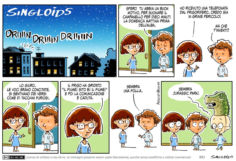 Bob: Spero che tu abbia un buon motivo per suonare il campanello per dieci minuti la domenica mattina prima dell’alba. – Meg: Ho ricevuto una strana telefona dal frigo. Credo sia in grave pericolo. – Bob: Ma che t’inventi? – Meg: Lo giuro. Le voci erano concitate, si sentivano dei versi come di tacchini furiosi. Il frigo ha gridato solo “il fiume! sito B! il fiume!” e poi la comunicazione è caduta. – Bob: Sembra una follia. – Sid: Sembra Jurassic park!
