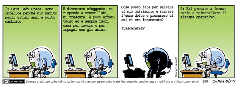 D: Cara Lady Grace, sono infelice perché mio marito negli ultimi anni è molto cambiato. È diventato sfuggente, mi risponde a monosillabi, mi trascura, è poco affettuoso ed è sempre fuori casa per lavoro o per impegni con gli amici. Cosa posso fare per salvare il mio matrimonio e riavere l’uomo dolce e premuroso di cui mi ero innamorata? Abbandonata82 – R: Hai provato a formattarlo e reinstallare il sistema operativo?