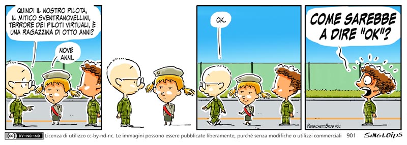 Sid: Quindi il nostro pilota, il mitico sventranovellini, terrore dei piloti virtuali, è una ragazzina di otto anni? – Sventranovellini: Nove anni. Sid: Ok. – Bob: Come sarebbe a dire “OK”???