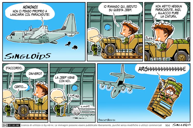Bob: Nonono! Io non ci penso proprio a lanciarmi col paracadute. Me ne starò sull’aereo, seduto su questa jeep. – Bob: Non metto nessun paracadute. Anzi, mi allaccio pure la cintura. – Sid: D’accordo. – Bob: Davvero? – Sid: Certo. Anche la jeep viene con noi. – Bob: Arghhhhhhhhhhhhh!