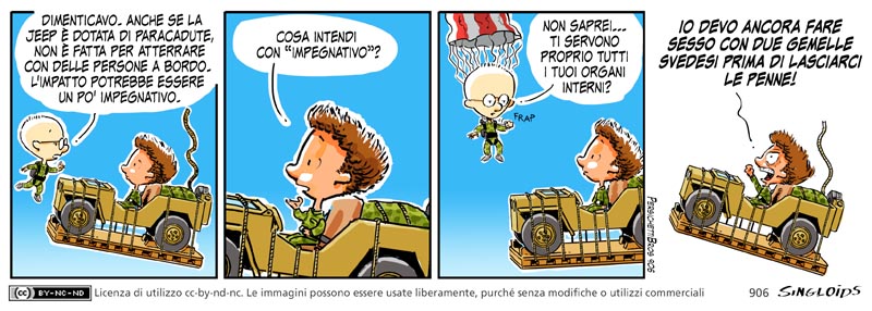 Sid: Dimenticavo. Anche se la jeep ha dei paracadute, non è fatta per atterrare con delle persone a bordo. L’impatto potrebbe essere un po’ impegnativo. – Bob: Cosa intendi con impegnativo? – Sid: Non saprei… Ti servono proprio tutti i tuoi organi interni? – Bob: “IO VOLEVO RIUSCIRE A FARE SESSO CON DUE GEMELLE SVEDESI PRIMA DI LASCIARCI LE PENNE!”