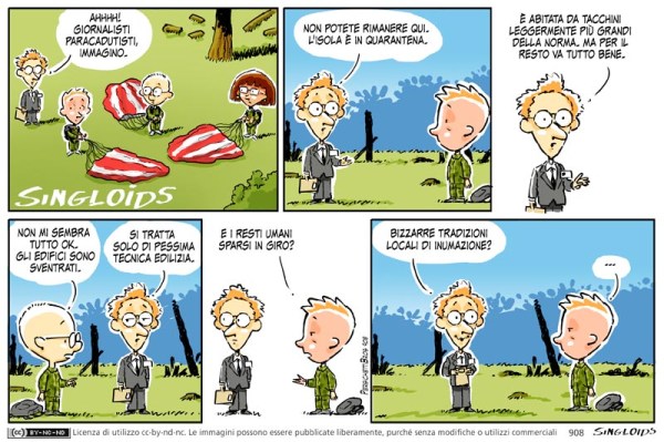 Dirigente: Ahhhh. Giornalisti paracadusti, immagino. – Ted: Cosa? – Dirigente: Non potete rimanere qui, l’isola è sotto quarantena. Ci sono tacchini leggermente più grandi della norma. Per il resto va tutto bene. – Ted: Non mi sembra tutto ok. Gli edifici sono sventrati. – Dirigente: Si tratta solo di pessima tecnica edilizia. – Ted: E i resti umani sparsi in giro? – Dirigente: Bizzarre tradizioni locali di inumazione?