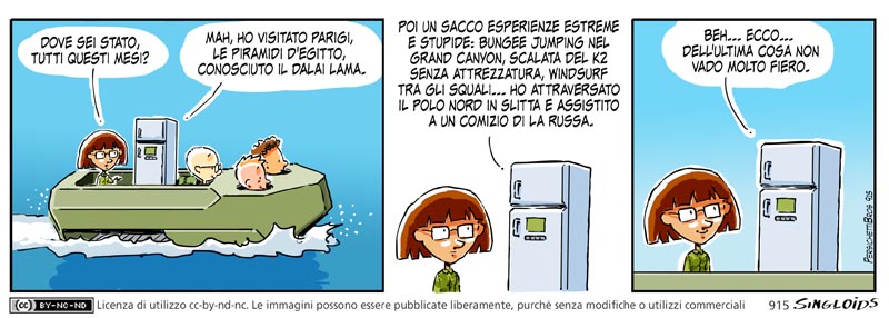 meg: Dove sei stato, tutti questi mesi? – Frigo: Mah, ho visitato Parigi, le piramidi d’Egitto, conosciuto il Dalai Lama. – Frigo: Poi un sacco esperienze estreme e stupide: bungee jumping nel grand canyon, scalata del K2 senza attrezzatura, windsurf tra gli squali… ho attraversato il Polo Nord in slitta e assistito a un comizio di La Russa. – Frigo: Beh… ecco… dell’ultima cosa non vado molto fiero.
