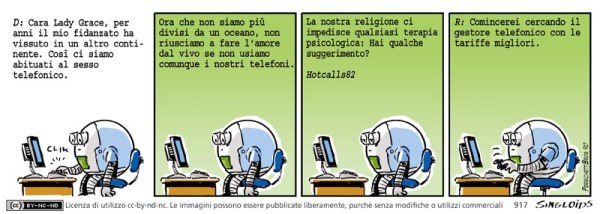 D: Cara Lady Grace, per anni il mio fidanzato ha vissuto in un altro continente. Così ci siamo abituati al sesso telefonico. Ora che non siamo più divisi da un oceano, non riusciamo a fare l’amore dal vivo se non usiamo comunque i nostri telefoni. La nostra religione ci impedisce qualsiasi terapia psicologica: Hai qualche suggerimento? hotcall82 – R: In questo caso, comincerei cercando un gestore telefonico con una tariffa migliore.
