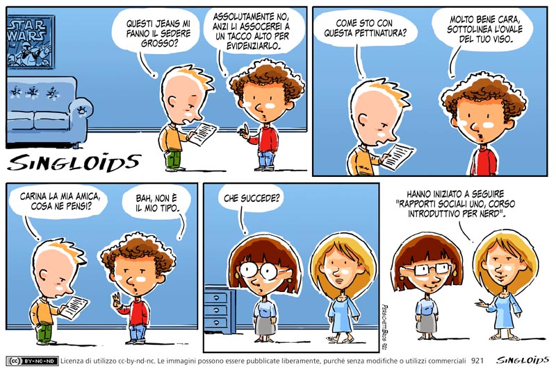 Ted: Questi jeans mi fanno il sedere grosso? – Bob: Assolutamente no, anzi li associerei a un tacco alto per evidenziarlo. – Ted: Come sto con questa pettinatura? – Bob: Molto bene cara, sottolinea l’ovale del tuo viso. – Ted: Carina la mia amica, cosa ne pensi? – Bob: Bah, non è il mio tipo. – Meg: Che succede? – Gea: Stanno seguendo il corso “Rapporti sociali I, corso introduttivo per nerd”