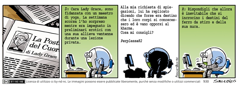 D: Cara Lady Grace, sono fidanzata con un maestro di yoga. La settimana scorsa l’ho sorpreso mentre era impegnato in preliminari erotici con una sua allieva ventenne durante una lezione privata. Alla mia richiesta di spiegazioni, lui ha replicato dicendo che forse era destino che i loro corpi si conoscessero ed è vano opporsi al kharma. Cosa mi consigli? Perplessa80 – R: Rispondigli che allora è inevitabile che i destini del ferro da stiro e della sua nuca si incrocino.