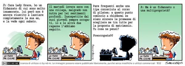 D: Cara Lady Grace, ho un fidanzato di cui sono molto innamorata. Lui in realtà non è ancora riuscito a lasciare del tutto la sua ex-fidanzata e la vede ogni sabato. Il martedì invece esce con una collega per la quale però non nutre sentimenti profondi. Insospettite dai suoi giovedì sempre occupati, io e le altre due fidanzate l’abbiamo seguito. Pare che frequenti anche una ragazza conosciuta al corso di pilates. Ora però comincio a chiedermi se siano sincere le promesse di scegliere me tra tutte per la proposta di matrimonio. Tu cosa ne pensi? Preoccupata90 – R: Ma hai un fidanzato o una multiproprietà?