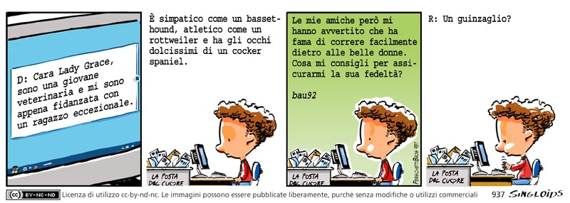 D: Cara Lady Grace, sono una giovane veterinaria e mi sono appena fidanzata con un ragazzo eccezionale. È simpatico come un basset-hound, atletico come un rottweiler e ha gli occhi dolci di un cocker spaniel. Le mie amiche però mi hanno avvertito che ha fama d’essere uno che corre facilmente dietro alle belle donne. Cosa mi consigli per assicurarmi la sua fedeltà? – R: Un guinzaglio?