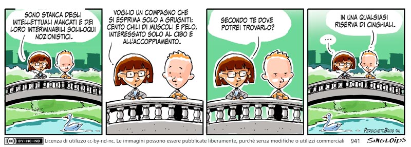 Meg: Sono stanca degli intellettuali mancati e dei loro interminabili soliloqui nozionistici. Voglio un compagno che si esprima solo a grugniti: cento chili di muscoli e pelo, interessato solo al cibo e all’accoppiamento. – Meg: Secondo te dove potrei trovarlo? – Ted: In una qualsiasi riserva di cinghiali.